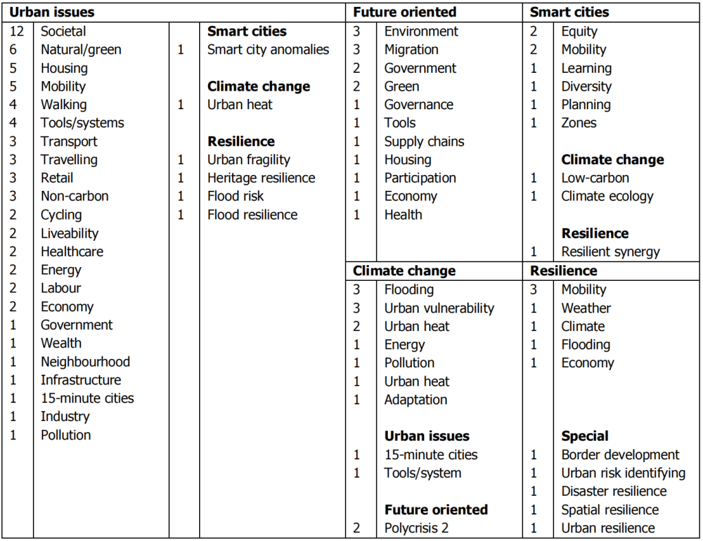 Analysing the results, it can be concluded that for cities in general (urban issues), basic amenities remain important: a positive social and societal context, good housing, and opportunities for mobility, exercise, and travel. It’s also notable that the “polycrisis,” the theme of the conference, received few presentations focus. Remarkably, “green spaces in the city” receive much more attention than energy. This seems to be a trend reversal.