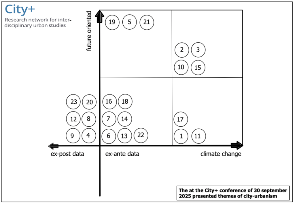 With participation from European and Asian countries, and a growing number of attendees, researchers as it turns out every year, that work closely at the forefront of interdisciplinary urban studies, the annual City+ conference can also be seen as an annual update on the latest trends of research in urban development in the context of its regional landscape. Therewith it becomes interesting to analyse the themes and topics introduced, as a signal function for research and cities in development, which new developments deserve attention. To explore this, the presentations at the City+2025@Oxford conference were analysed at two levels: the themes presented and, for each, the topics discussed as relevant. This is of course within the framework of the research field adopted by City+.
