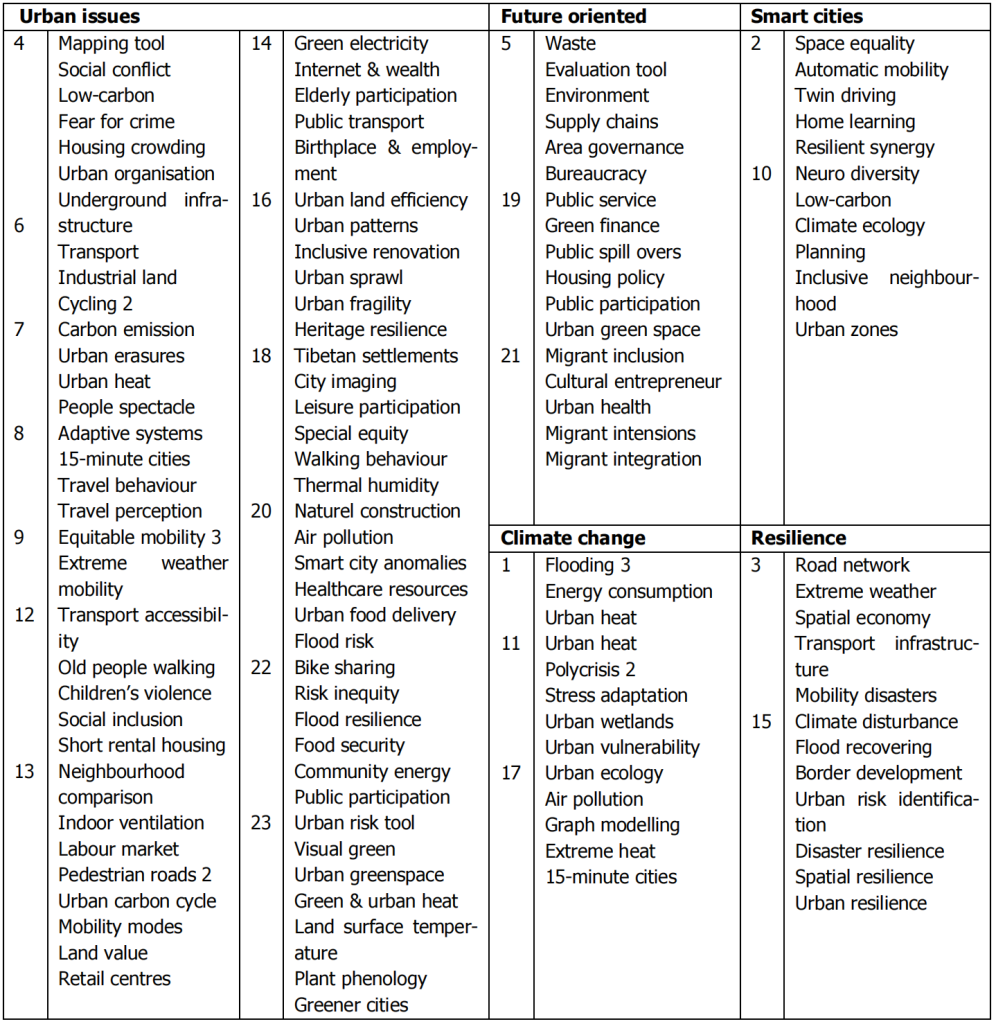 In total, the submitted and peer-reviewed presentations for the City+2025@Oxford conference were categorised under 23 themes, which concern great global changes influencing the life and liveability of people in cities with climate change in special. Interests should be which other influencing global changes were suggested and which themes were future-oriented, not only discussing the past or actual situations, but giving a sketch of a possible future based on data analysis. For the themes see Table 2.