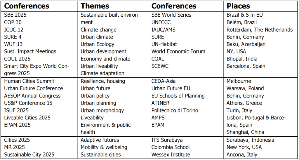 Table 1, overview of 2025 conferences regarding the city, sustainability and liveability